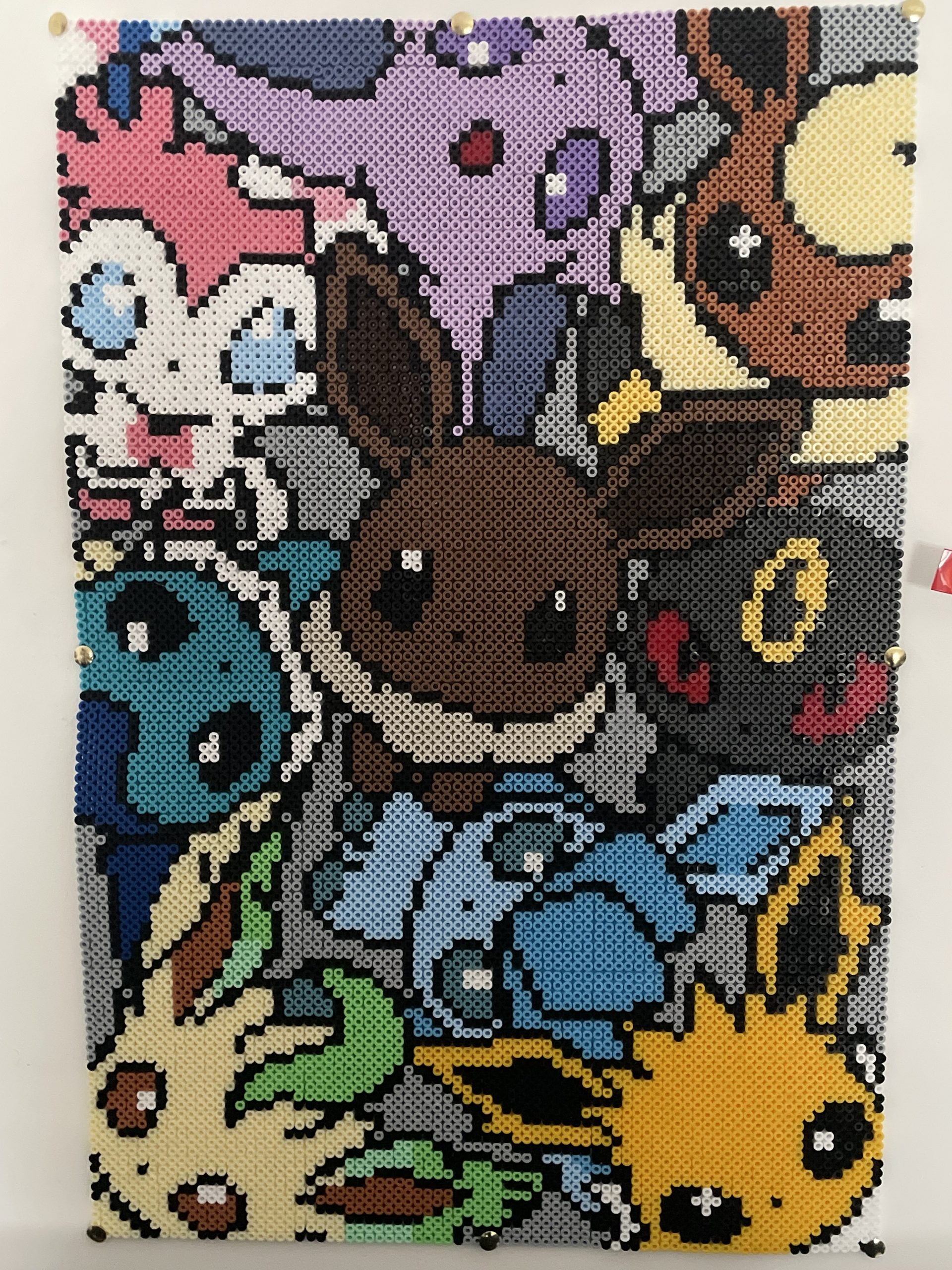 Tableau évoli et ses évolutions. De gauche à droite : Nymphali Mentali Pyroli Aquali Evoli Noctali Phylalli Voltali Tableau en perle hama midi.